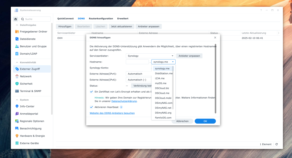 Achte darauf, dass du mit deinem Synology Konto angemeldet bis, dass du als Serviceanbieter Synology hast und einen freien Hostname auswählst. Dazu erstelle Dir direkt das Let’s Encrypt Zertifikat, ohne dies wird es nicht möglich sein, sichere und verschlüsselte Verbindung aufzubauen.