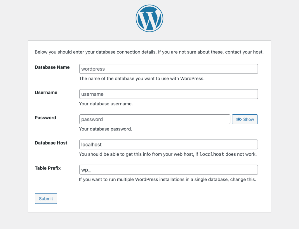 Es sollte auch bei Dir so aussehen, WordPress ist ready zur Installation! Im nächsten Schritt solltest Du die Maske deiner Datenbank sehen: